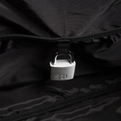 6 bolsillos, 3 de ellos con cremallera. Soportes candado y tarjeta