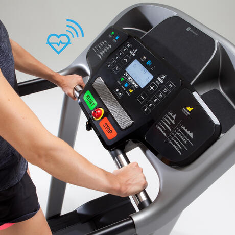 La cinta para correr T540 se entrega con un cinturón torácico para medir de forma continua la frecuencia cardíaca, así como con sensores manuales para una estimulación puntual durante la sesión.